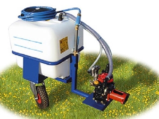 Anbauspritze für Einachsgeräte mit 5 bis 7 PS und Zapfwelle. 120 ltr. Polyethylen Tank Stahlrohrrahmen pulverbeschichtet Rahmen mit zwei Pendelrädern komplett mit Saugfiltern ohne Fahrersitz drehbare Handholme erforderlich