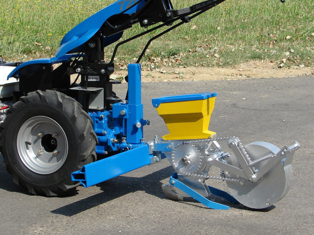Diese modulare Sämaschine wurde entwickelt, um alle Bedürfnisse von Gärtnern zu erfüllen. Es ist möglich, ein oder mehrere Elemente hinter Ihrem Einachser oder Ihrer Motorhacke anzubringen, um Getreide, Hülsenfrüchte, Gemüse, Kräuter in gleichmäßigen Abständen zu säen.Die Bewegung des Saatgutverteilers wird durch das Hinterrad mit Ritzel-, Kronen- und Kettengetriebe gegeben. Aus dem Trichter fällt das Saatgut in eine Lochscheibe, die entsprechend der Größe des Saatguts und dem vom Kunden gewünschten Reihenabstand angefertigt wird. Jedes Loch entspricht einem Saatkorn und das garantiert Präzision in der Reihe. Es handelt sich um eine Präzisionsmaschine, da der Saatverteiler aus einer Wabenscheibe aus Aluminium besteht, die das Fallen eines einzelnen Saatkorns garantiert. Diese Scheibe wird entsprechend den vom Anwender geforderten Saatabständen präpariert. Im Minimum können bei Rucola 2 kg Saatgut/ ha (geringe Geschwindigkeit) oder bei Spinat 5 bis 7 kg Saatgut/ ha (mittlere Fahrgeschwindigkeit) ausgebracht werden.Für besondere Aussaat (Karotte, Rettich, Rucola, Baldrian) ist die Sämaschine auch mit einer 7 cm breiten Doppelschar möglich. kostenpflichtige Optionen: größerer Saatgutbehälter verschiedene Säscheiben
